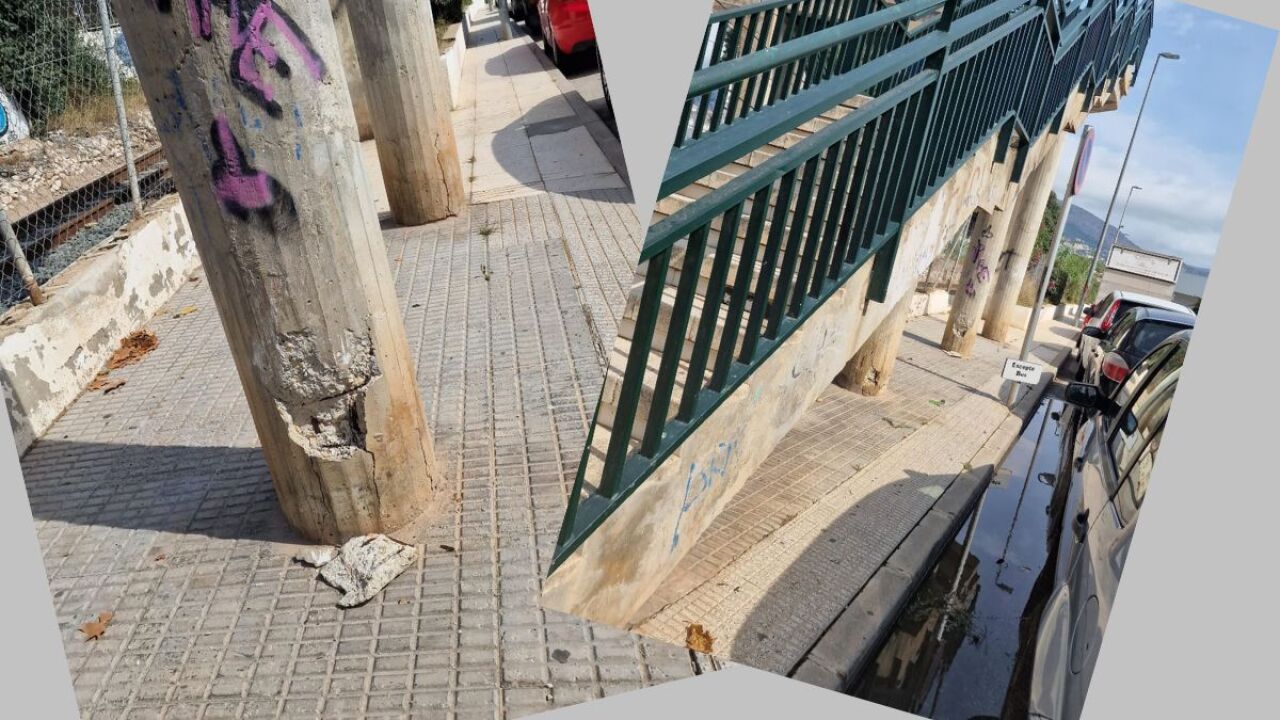 El edil del PP alteano, Paco Berenguer, afirma que ha constatado que la pasarela, por la que pasan a diario muchos alumnos y padres y madres de los mismos, se encuentra “en un primer estado de peligro estructural”, dice textualmente, al presentar “tres pilares explosionados en su base, con vigas y armaduras vistas y oxidadas”. También la barandilla presenta un visible estado de oxidación por lo que algunos de los tramos de acero han desaparecido.