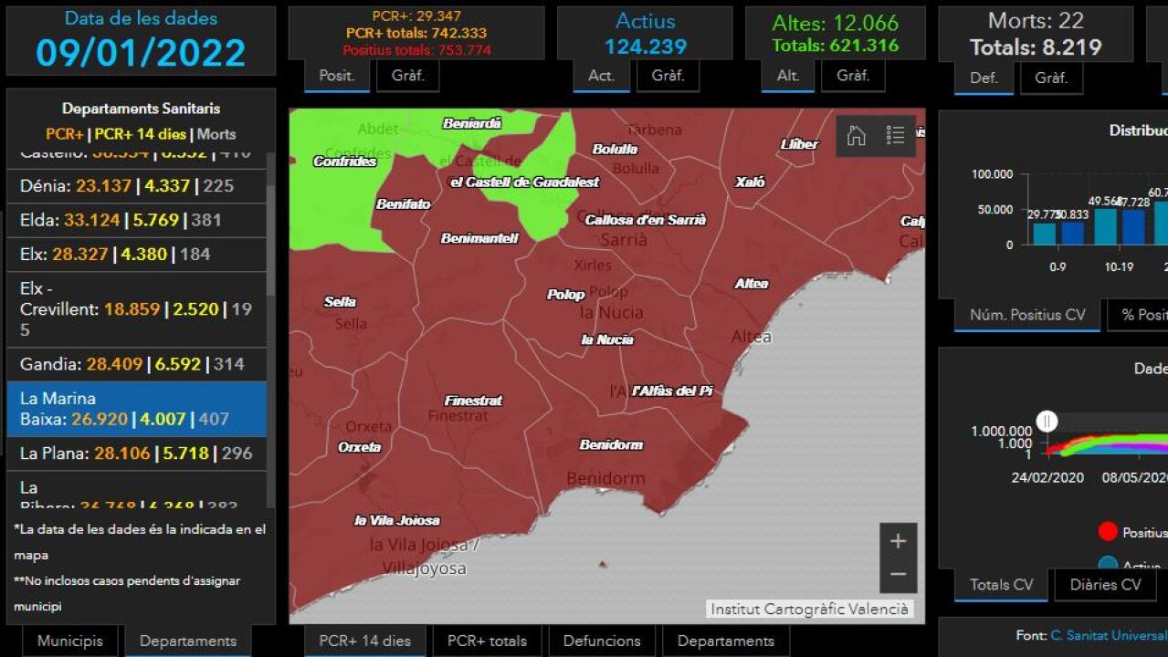 Concretamente la marina baixa presenta una incidencia media acumulada de 2.191 casos por 100.000 habitantes. Municipios como Benidorm, La Nucía o Callosa presentan incidencias por encima de los 2.000 casos.