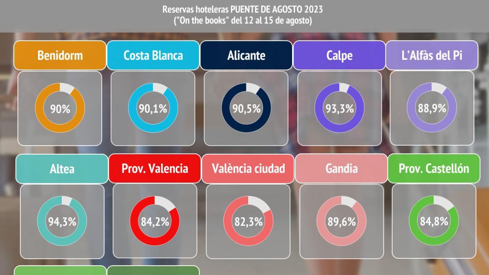De estas poblaciones, Altea tendrá la mayor tasa de ocupación de camas hoteleras, motivada por los fuegos artificiales del "Castell de l'Olla", que se celebrarán este sábado. A la localidad alteana le sigue Calpe con un 93% y Benidorm con un 90%.