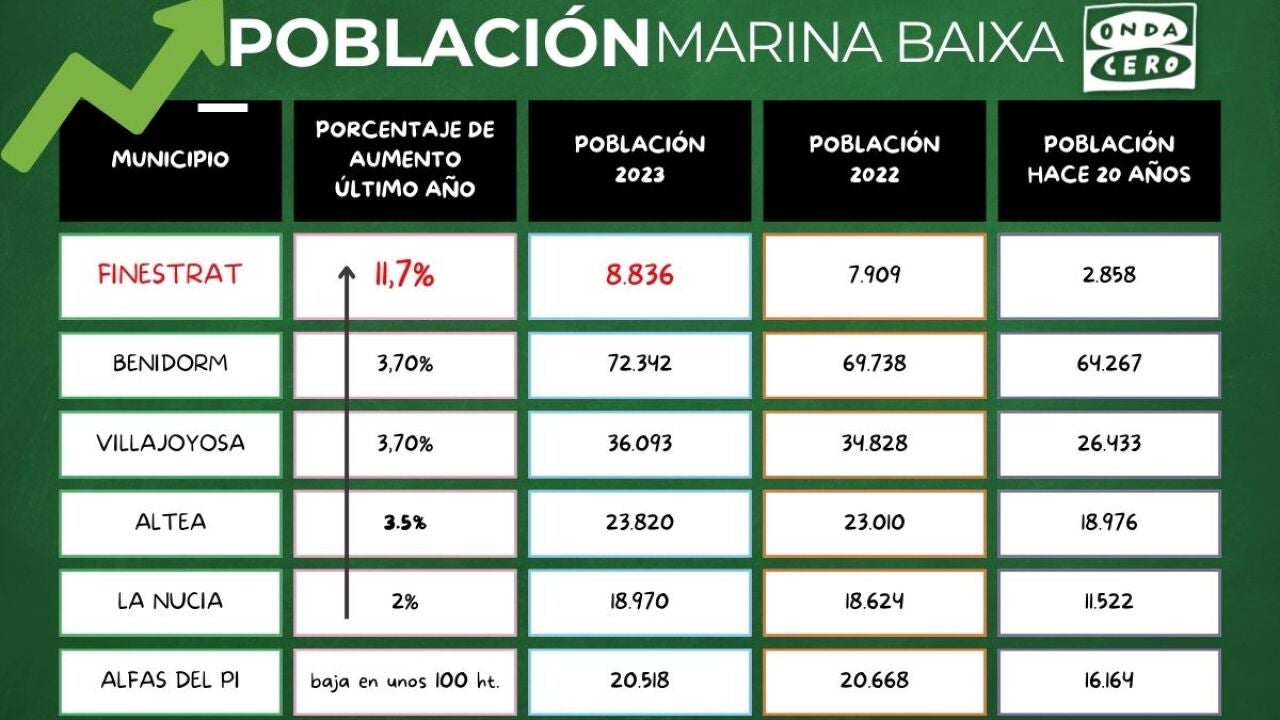Según los datos proporcionados por el Instituto Nacional de Estadística, Finestrat lidera el aumento de la población en la Marina Baixa, aumentando casi un 12% respecto a 2022, y roza los 9.000 habitantes. Jamás se había acercado a un volumen similar de residentes y de hecho, en 2003, ni siquiera llegaba a los 3.000 habitantes.
