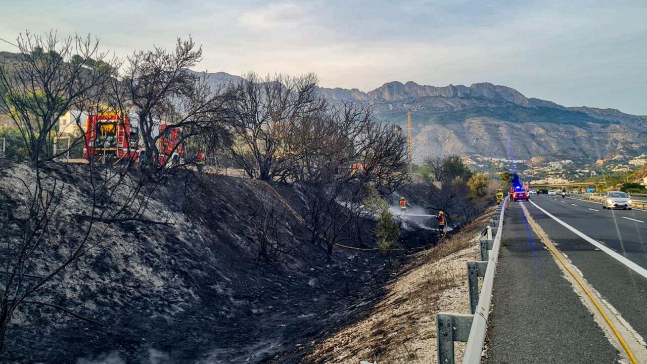 Un incendio declarado en una zona de matorral junto a la AP7 a su paso por Altea activa el nivel 1 del Plan Especial de incendios forestales con medios aéreos y terrestres