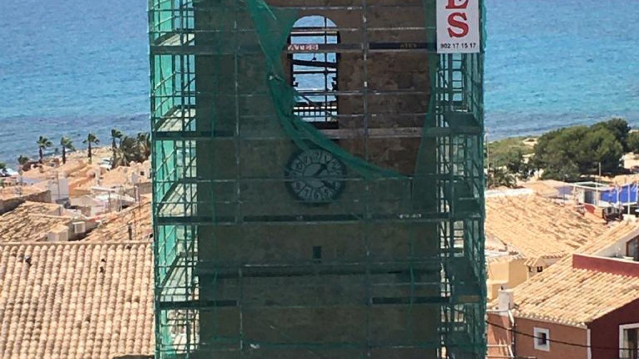 Los andamios que permitirán el acceso a las obras de la torre de la iglesia de Nuestra Señora de la Asunción en La Vila Joiosa ya se han acabado de montar y se instaló, con ellos, una red de seguridad. Sin embargo, la instalación de esta red ha provocado las protestas del grupo ecologista el Xoriguer que considera que afecta a la nidificación al las aves