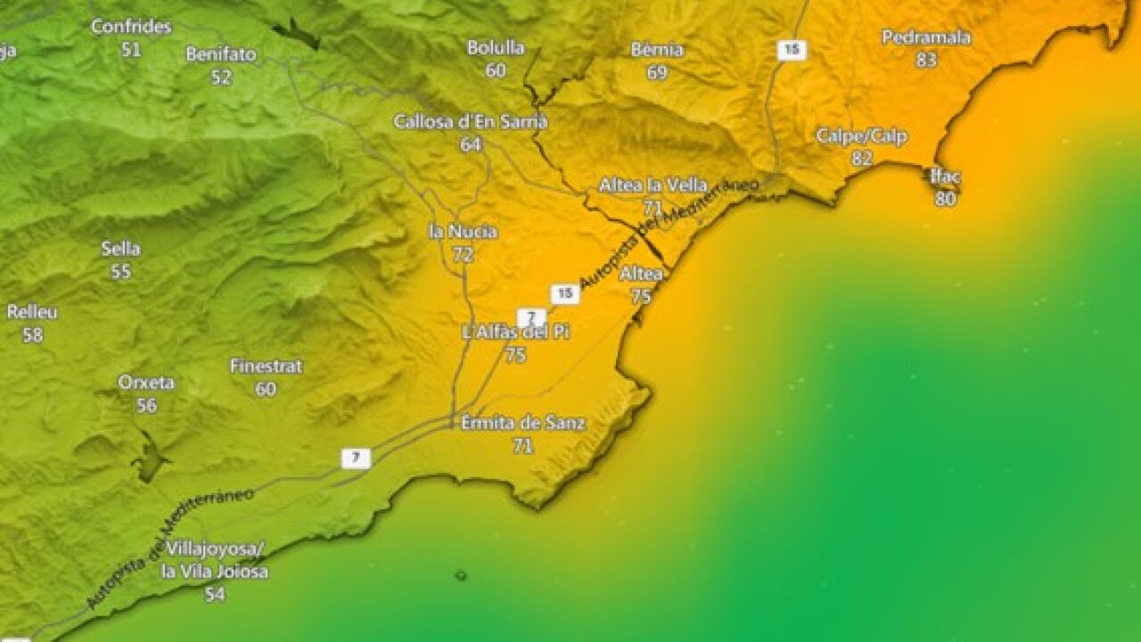 Por la noche las temperaturas caerán hasta con 12º de diferencia, como sucederá en Confrides, que alcanza la mínima de 5º. Bajarán a los 8º en Guadalest, a los 10º en Callosa, La Nucía o Polop y serán algo más suaves esas mínimas, en la costa, donde no bajarán de 12 o 13º.