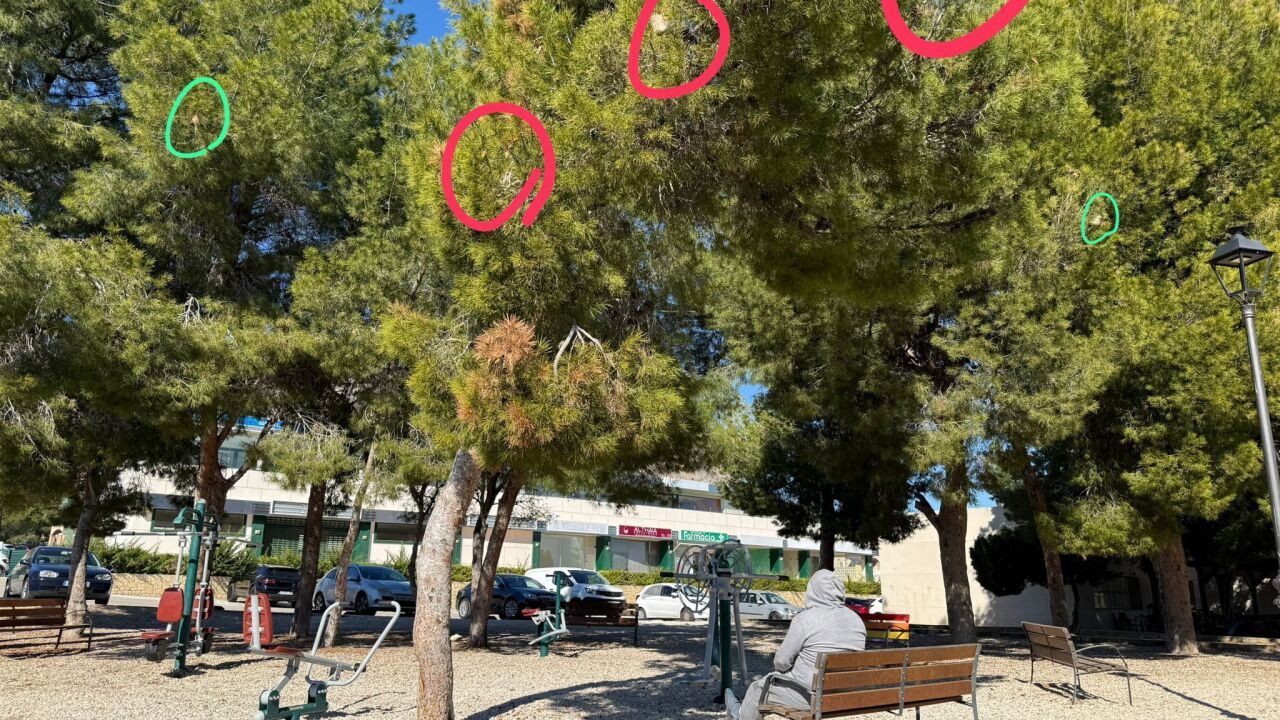 Actuar contra la procesionaria es la petición que lanzan vecinos de Polop, de la urbanización la Alberca. Llevan meses denunciando la proliferación de bolsas de procesionaria en los pinos de lugares públicos próximos a sus domicilios. Si bien a final de año el ayuntamiento actuó en algún punto, el no hacerlo en otros puntos y la intensidad de la plaga han hecho que las bolsas hayan proliferado y las orugas hayan empezado a abandonar sus nidos. Están en aceras, calzadas, parque canino y en un parque de juegos para personas adultas, así como en las proximidades del centro social, frecuentado por cientos de vecinos.
