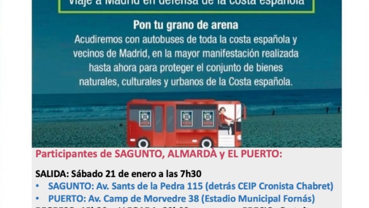 Concretamente, los vecinos y vecinas de las Playas de Almardà, Corinto y Malva-rosa fletarán dos autobuses gratuitos para todos aquellos ciudadanos y ciudadanas que, desde Sagunto y El Puerto, quieran asistir a la manifestación "Salvemos el Mediterráneo". "De El Puerto, el autobús saldrá del Estado Fornás y, desde Sagunto, saldremos desde la zona trasera del Colegio Cronista Chabret, ambos autobuses a las 07:30 horas", detalla la presidenta de la Asociación de Vecinos de la Playa de Almardà, Corinto y Malva-rosa, Amparo Peris, en declaraciones a Onda Cero. "Quienes valoramos el estilo de vida mediterráneo y compartimos nuestras playas, nos hemos visto obligados a convocar esta manifestación para mostrar a la sociedad y al Gobierno nuestra voluntad de que la costa española sea respetada", añade el portavoz de la entidad vecinal, Fernando Doblas, preguntado por esta emisora de radio.