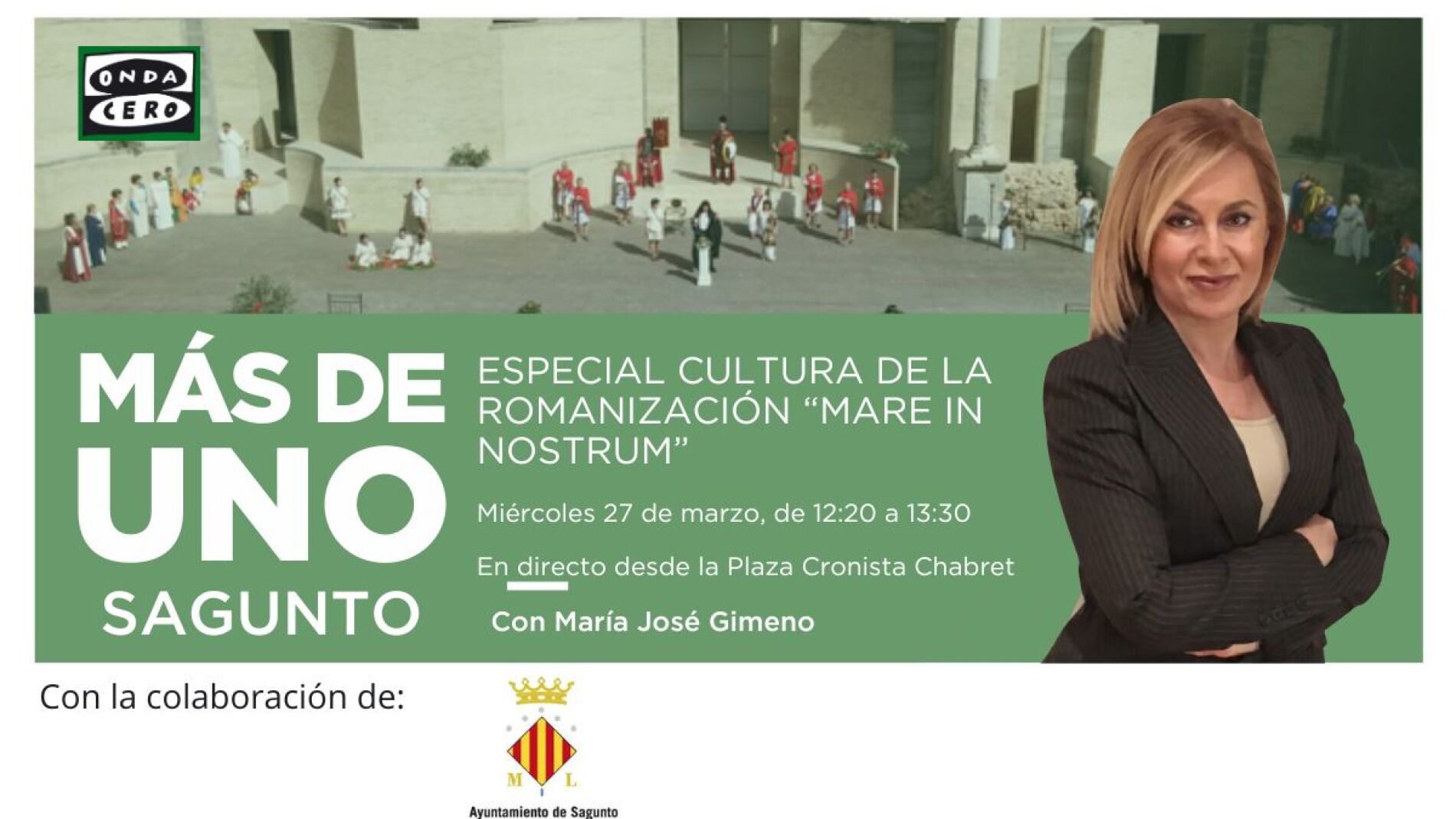 El equipo de Onda Cero, de la mano de la delegación de Cultura del Ayuntamiento de Sagunto, estará desde las 12.20 y hasta las 13.30 en el Terraet de la Glorieta desde la Plaza Cronista Chabret.