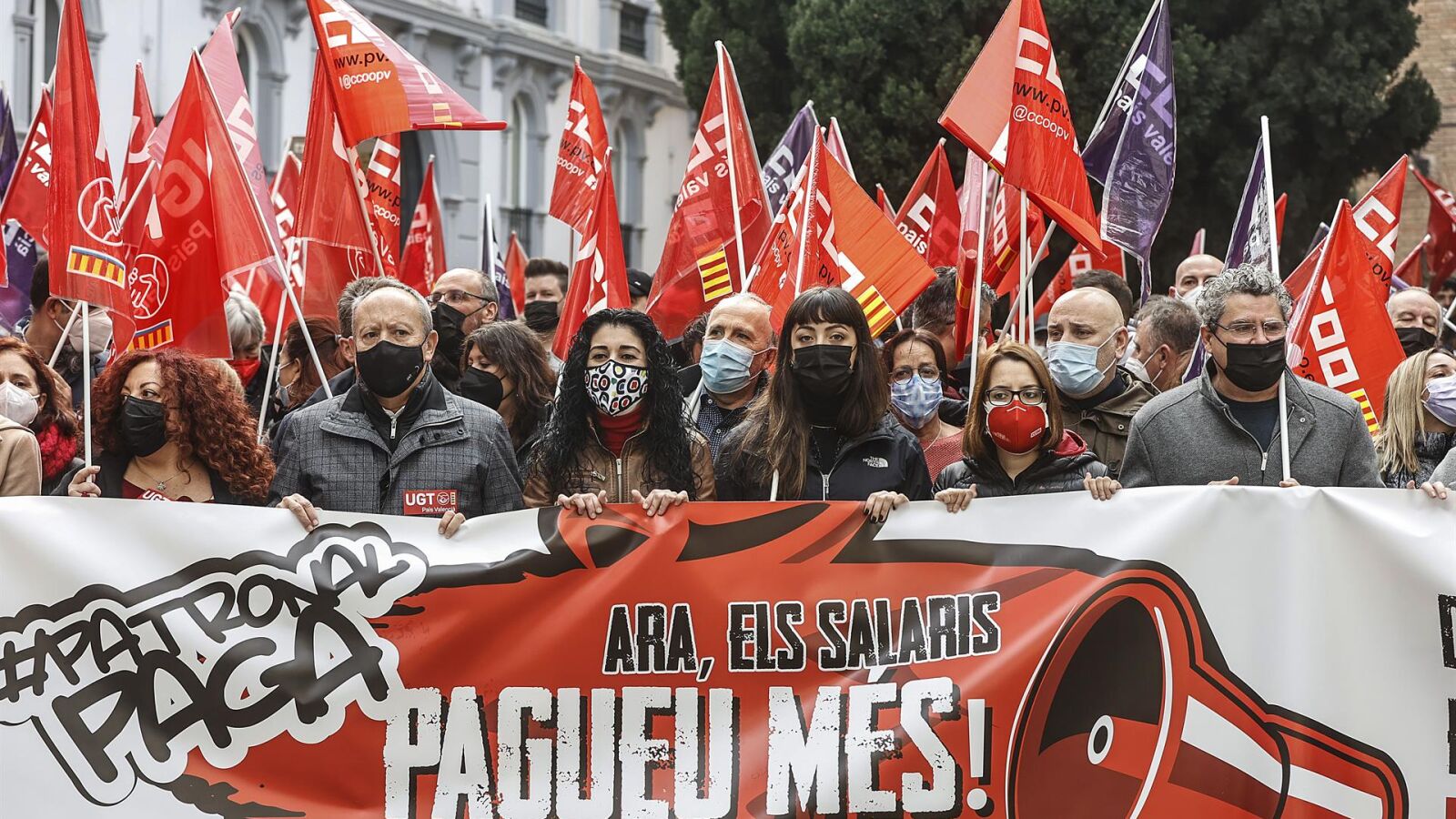 UGT PV y CCOO PV se han concentrado este jueves ante la Confederación Empresarial de la Comunitat Valenciana (CEV) para reclamar, entre otros asuntos, que desbloquee la negociación de los convenios colectivos. Los sindicatos exigen que “salarios dignos” que se ajusten a la subida de la inflación, que se sitúa ya en el 5,5%.