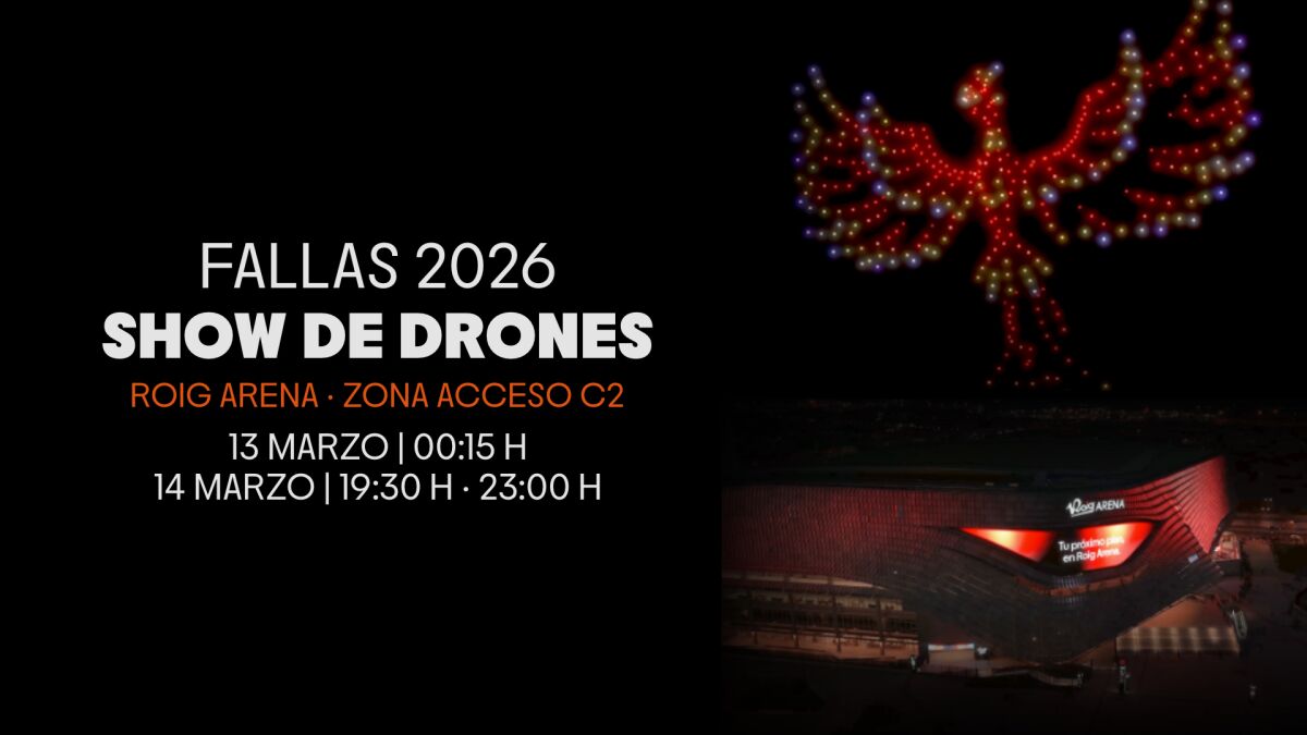 Como preámbulo a los días grandes de Fallas, Roig Arena ha programado un espectáculo gratuito de drones junto al recinto. Serán tres pases que tendrán lugar los días 13 y 14 de marzo: uno en la noche del viernes 13 de marzo (con inicio a las 00.15 horas); y dos el sábado 14 de marzo (el primero a las 19.30 horas y el segundo a las 23.00 horas).