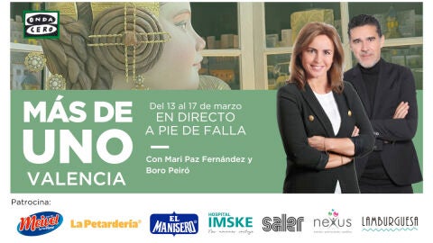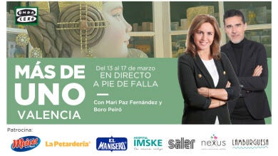Del 13 al 17 de marzo,el programa Más de Uno Valencia se emite en directo desde algunas de lasfallasmás emblemáticas de nuestra ciudad. Con Boro Peiró y el equipo de Más de Uno Valencia sentiremos más cerca lasfallascon cobertura en directo de los actos y entrevistas a los protagonistas de la fiesta.