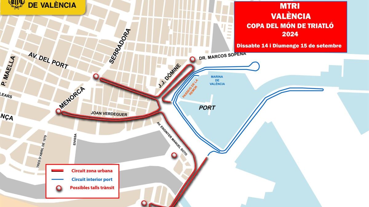 Así pues, el circuito para las pruebas de ciclismo, tanto del sábado como del domingo, se iniciará en la plaza de l'Aigua y pasará por el vial de La Marina, seguirá por la calle J.J. Dómine, por la avenida del Puerto, con giro justo antes de llegar a Serrería (en avenida del Puerto quedará habilitado, únicamente, el carril EMT-Taxi).