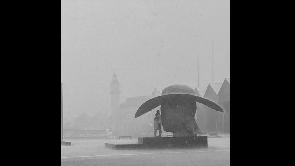 La tormenta de este lunes en Valencia sorprendió a una pareja que no dudó en resguardarse bajo 'La Pamela', una estatua obra del escultor Manolo Valdés. Este momento vivido en la Marina Real de Valencia fue capturado por una fotógrafa que ahora busca a estos enamorados.