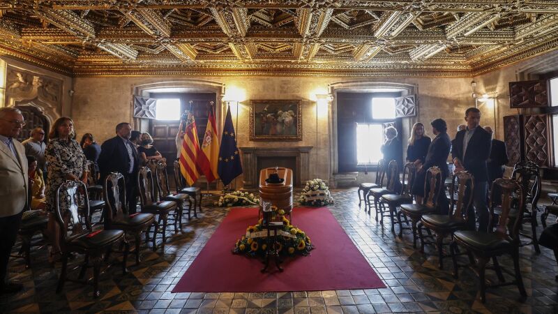 El Palau de la Generalitat ha acogido una lectura del poema 'Palabras para una despedida' de Francisco Brines, a cargo del poeta Vicente Pons, con Miguel Pérez a la guitarra interpretando, a su vez, 'Canción Árabe'. El féretro se ha subido al salón dorado del Palau, mientras que en el patio gótico, entre flores, ha estado disponible e libro de condolencia.