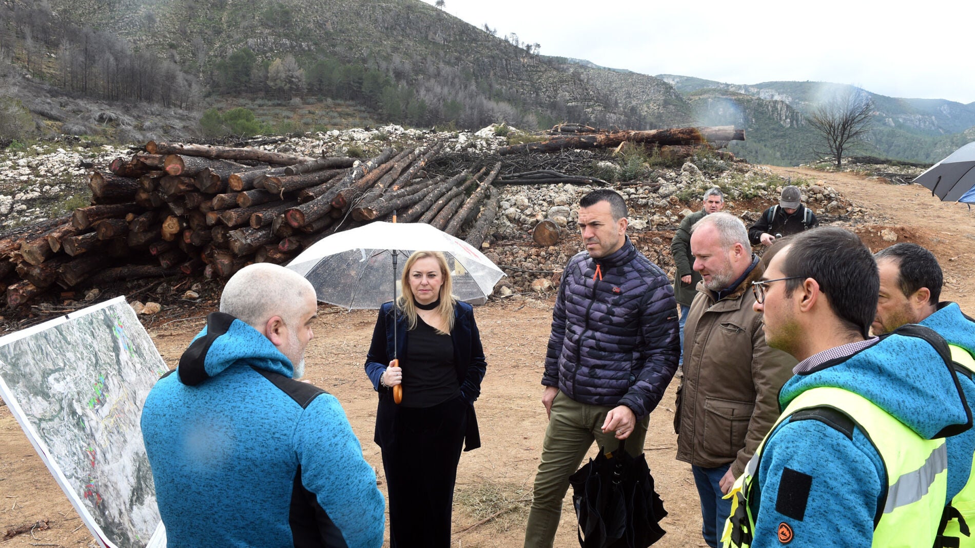 El presidente de la Diputació de València, Vicent Mompó, acompañado por la vicepresidenta, Natàlia Enguix, y el diputado de Medio Ambiente, Avelino Mascarell, ha visitado este viernes en Terrateig (Valencia) una de las zonas de trabajo de regeneración forestal que está coordinando la institución provincial en la superficie afectada por el conocido como 'incendio de Montitxelvo' que tuvo lugar en noviembre de 2023.