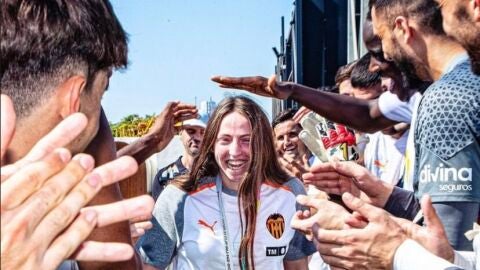 Sus compañeras de equipo la han recibido al grito de "campeona del Mundo" mientras que la primera plantilla del equipo masculino le ha hecho el pasillo de campeona.