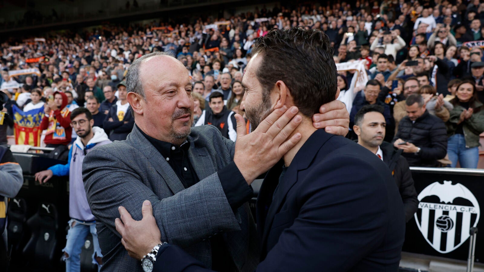 Justo antes de comenzar el encuentro se fundió en un abrazo con Rubén Baraja. Todas las cámaras y los flashes esperaban el momento para inmortalizarlo. Y seguro que a más de un valencianista le cayó una lágrima al verlo. El abrazo sincero de maestro y discípulo, de dos amigos hoy rivales sobre el césped,
