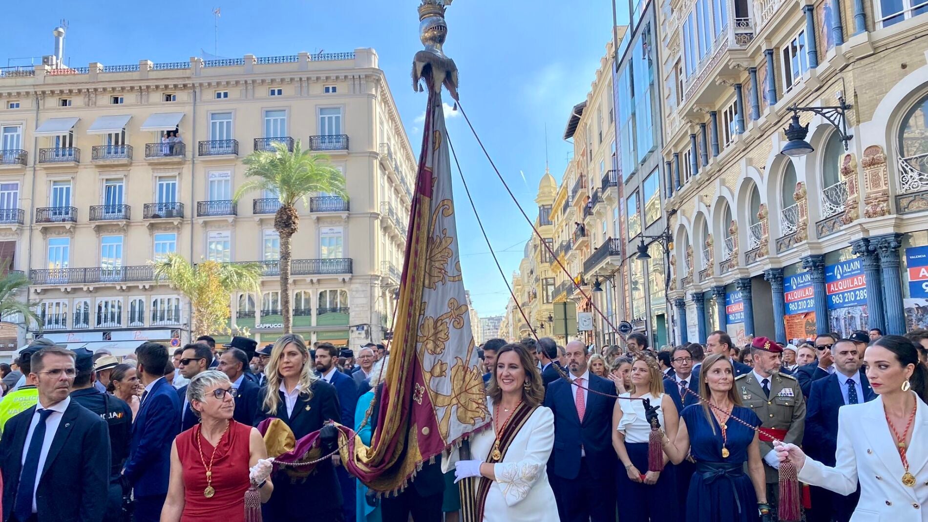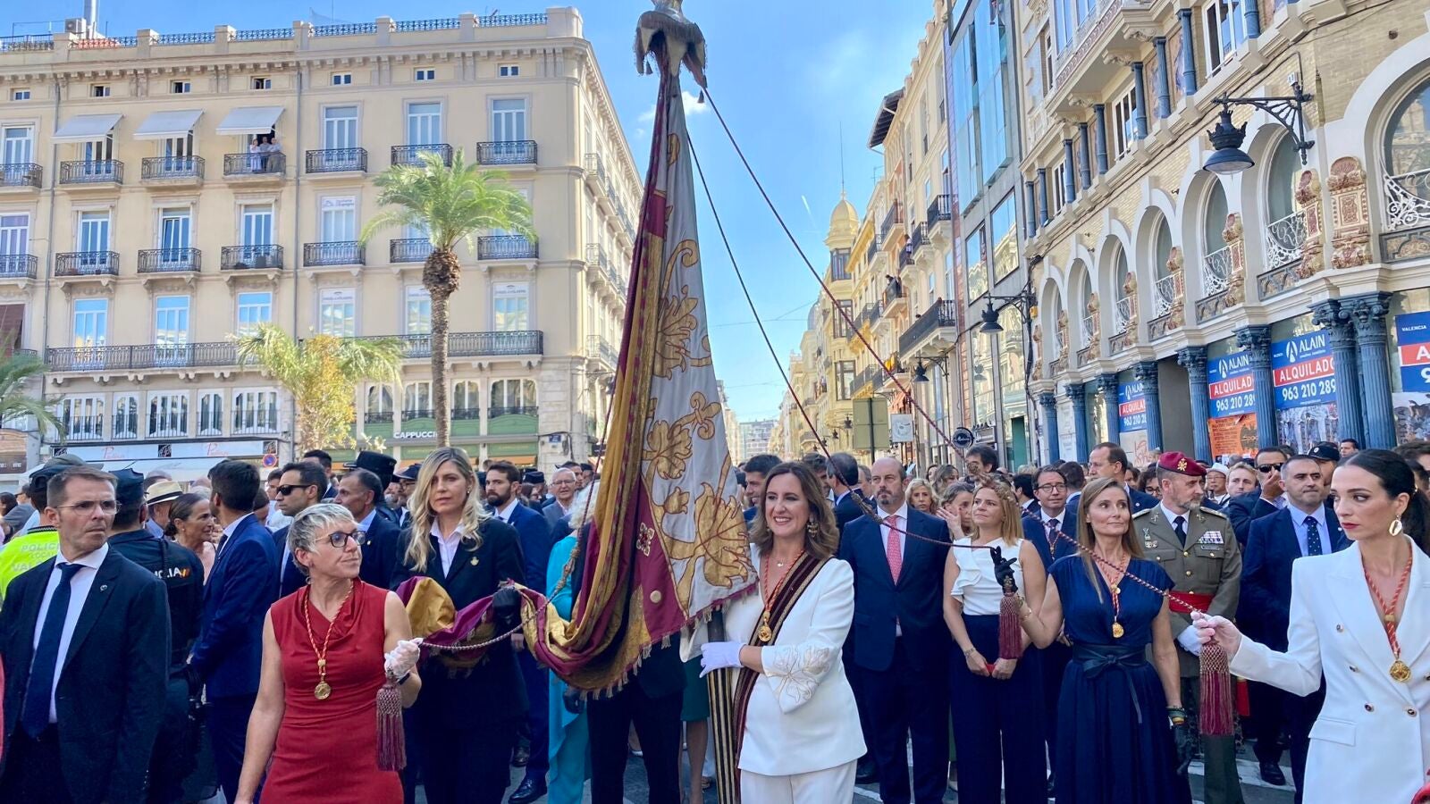 Los actos de celebración de esta jornada del 9 d´Octubre han continuado por las calles de la ciudad de València con la Procesión Cívica en la que la alcaldesa Mª José Catalá ha sido la encargada de portar la senyera por segunda vez puesto que ya fue la encargada de portarla hace cuatro años.