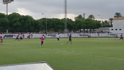 El Valencia regresaba este fin de semana de su stage en Suiza pero no ha sido hasta este martes cuando ha vuelto a los entrenamientos en la Ciudad Deportiva de Paterna. Y lo ha hecho en doble sesión, por la mañana cerrada y por la tarde abierta para que los aficionados pudieran ver a los de Gattuso ejercitarse sobre el césped de la Ciudad Deportiva de Paterna. Y la afición ha vuelto a responder con más de 300 valencianistas en las instalaciones de Paterna.