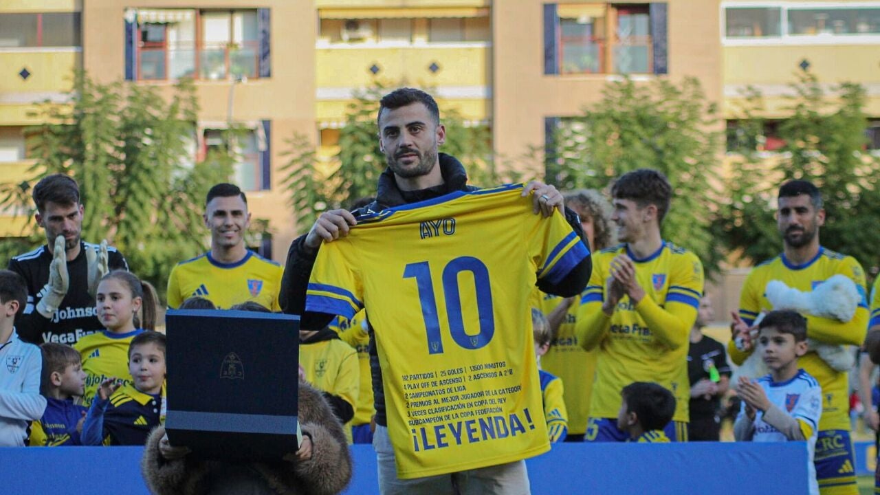Al que se le llegó a considerar como "el Mago", deja el Orihuela CF tras 182 partidos, 25 goles, 13.500 minutos de juego, 4 play offs de ascenso, 2 ascensos y 2 premios MVP de la categoría. El domingo pasado, en Los Arcos, antes del comienzo del partido frente al Elche Ilicitano, se ofreció un homenaje a Ayo ante su propia afición, en el que se le entregó una camiseta especial del Orihuela con el número que siempre ha llevado a la espalda, el 10, en la que se podía leer la palabra "Leyenda" y todos sus números de amarillo. También se le entregó una placa conmemorativa.