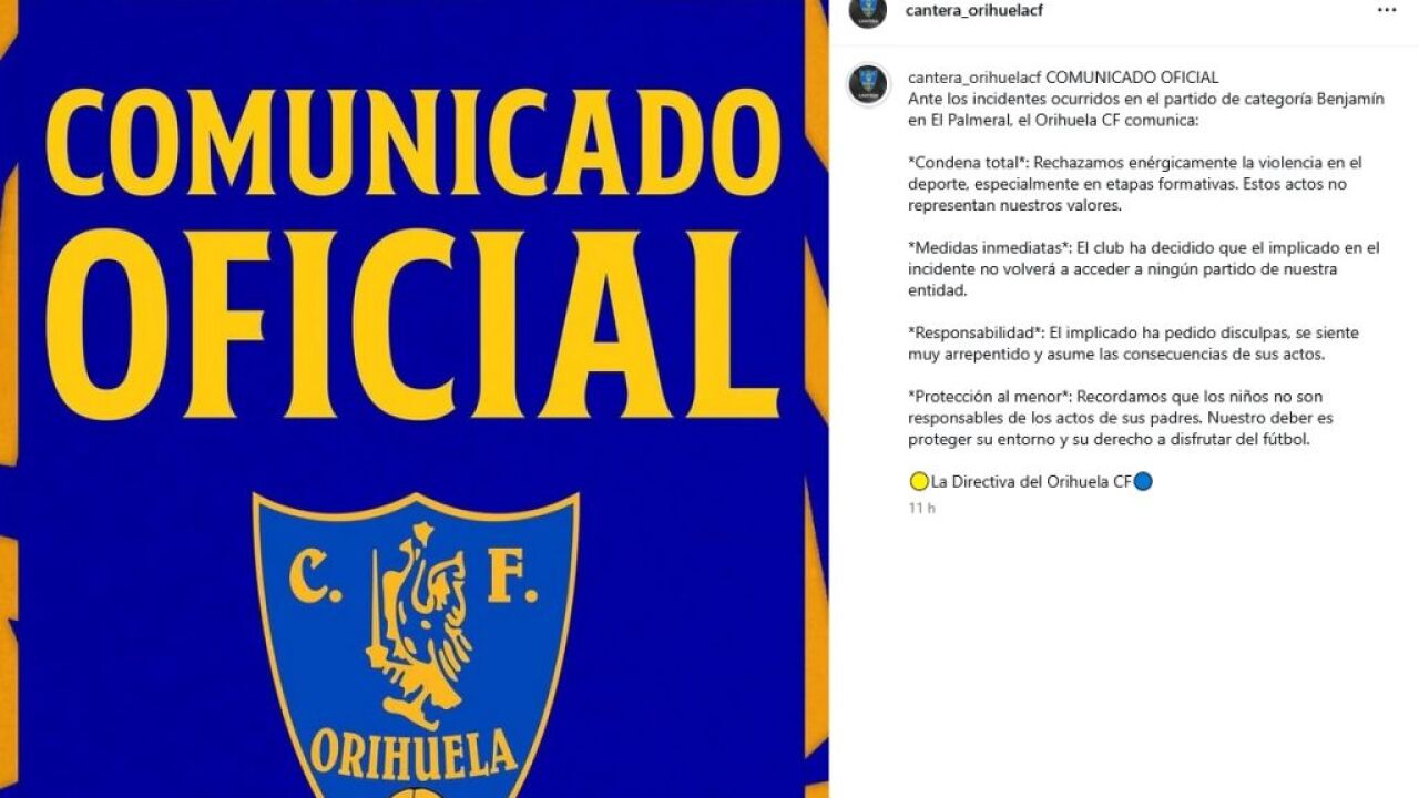 El Orihuela CF reaccionó con rapidez a lo ocurrido mediante un comunicado oficial difundido a través de las redes sociales de su cantera.