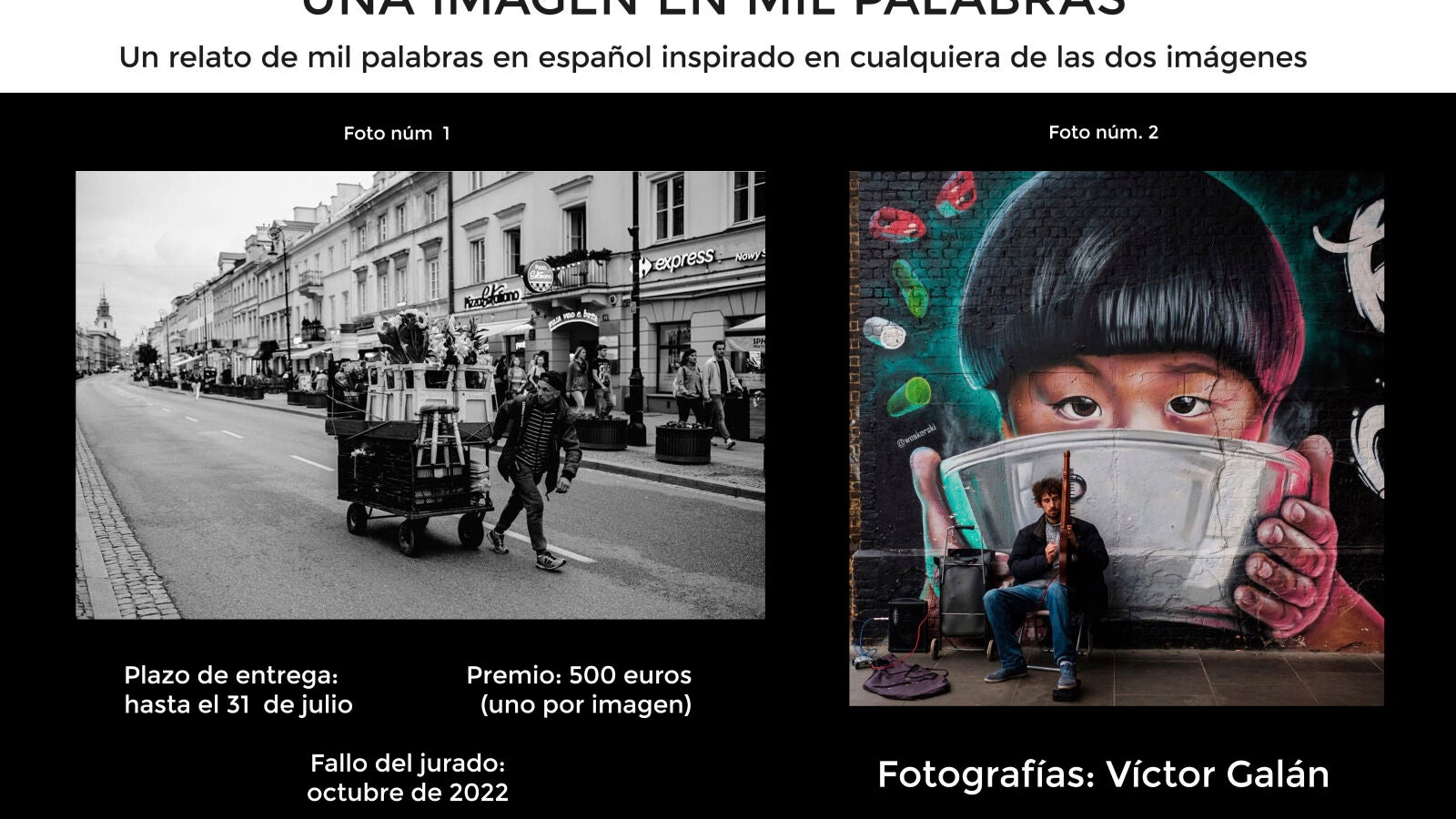 Para la presente edición, los relatos (de mil palabras exactas, excluido el título) podrán inspirarse en dos fotografías de Víctor Galán. Los ganadores obtendrán sendos premios de 500 euros cada uno.