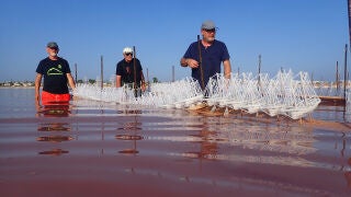 A algunas piezas todavía se les dará unas horas más bajo las rosadas aguas de la laguna de Torrevieja, que en estos días de canícula tiene un color espectacular.