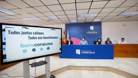 El alcalde de Torrevieja, Eduardo Dolón, junto con la concejal de Comercio y Hostelería, Rosario Martínez, el concejal de Economía y Hacienda, Domingo Paredes, el presidente de la Asociación de Pequeños y Medianos Comerciantes (APYMECO), Jorge Almarcha, y la responsable de la empresa Impronta Soluciones, Alicia Lozoya, han presentado en la mañana de hoy el BONO CONSUMO, una iniciativa del Ayuntamiento de Torrevieja en colaboración con APYMECO, para incentivar la compra en todos los sectores productivos de la localidad, especialmente en el Comercio y la Hostelería.