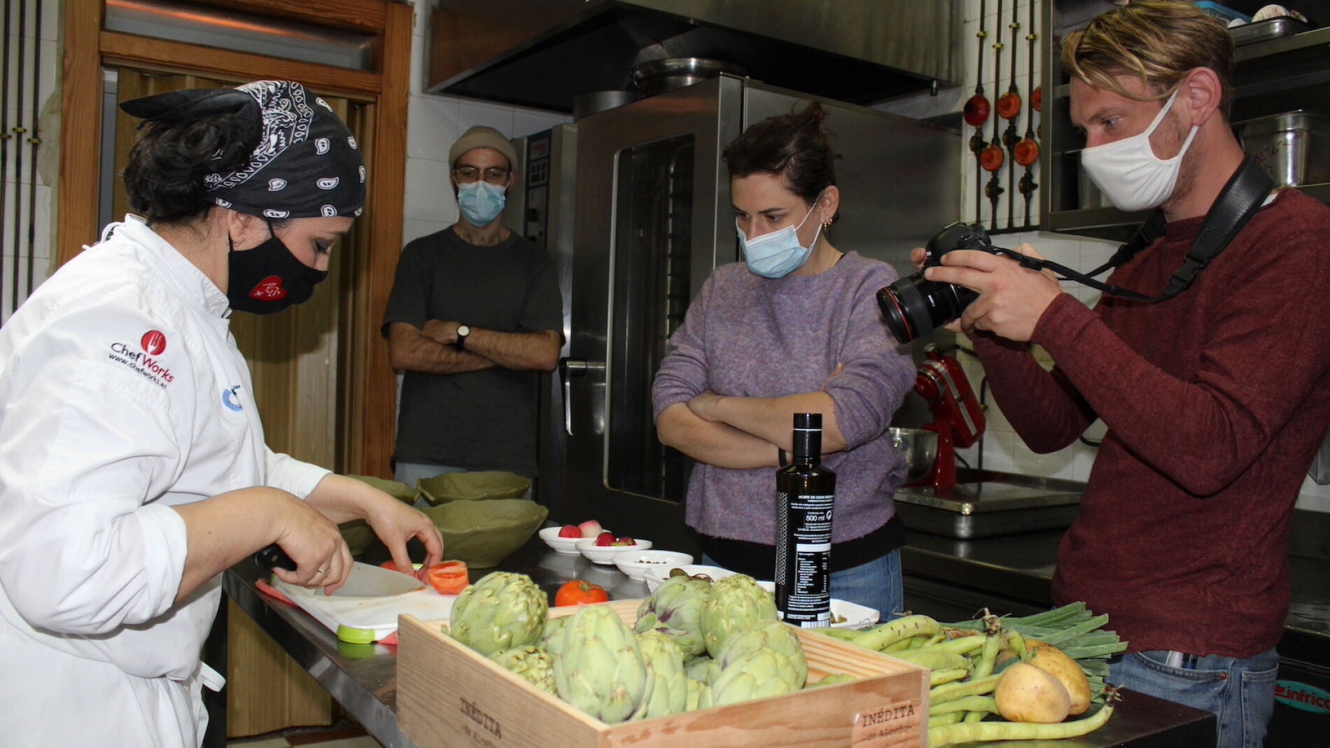 Claire Chaumeil ha completado su paso por la comarca con una experiencia gastronómica de la mano de Aurora Torres del restaurante La Herradura. Aurora Torres le enseñó a preparar una ensalada típica de la comarca con la alcachofa fresca en crudo junto a habas tiernas, tomates, encurtidos y capellán y continuó su viaje por los sabores tradicionales de la Vega Baja con un arroz con alcachofas y boquerones y unas alcachofas a la brasa con panceta.