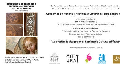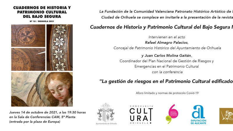 Intervendrán en el acto D. Rafael Almagro Palacios, Concejal de Patrimonio Histórico de Excmo. Ayuntamiento de Orihuela, y D. Juan Carlos Molina Gaitán, Coordinador del Plan Nacional de Gestión de Riesgos y Emergencias en el Patrimonio Cultural (Ministerio de Cultura y Deporte), con la conferencia:
