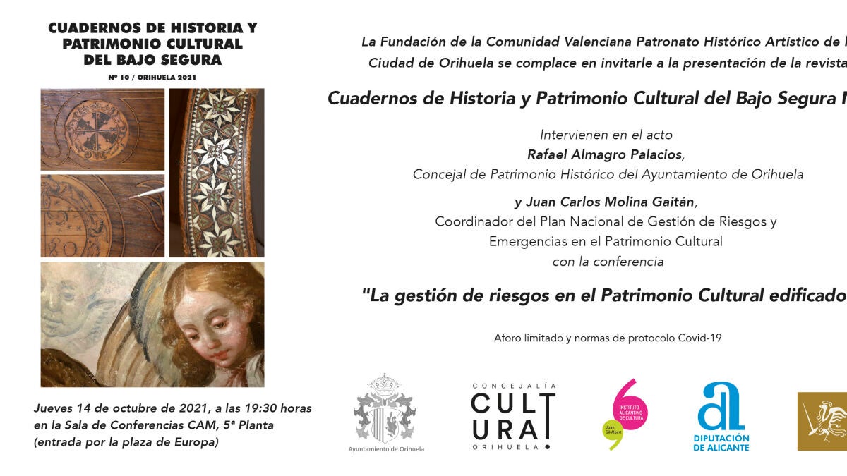El próximo jueves, 14 de octubre de 2021, a las 19:30 horas en la Sala de Conferencias de la CAM de Orihuela tendrá lugar la presentación de los Cuadernos de Historia y Patrimonio Cultural del Bajo Segura Nº 10.