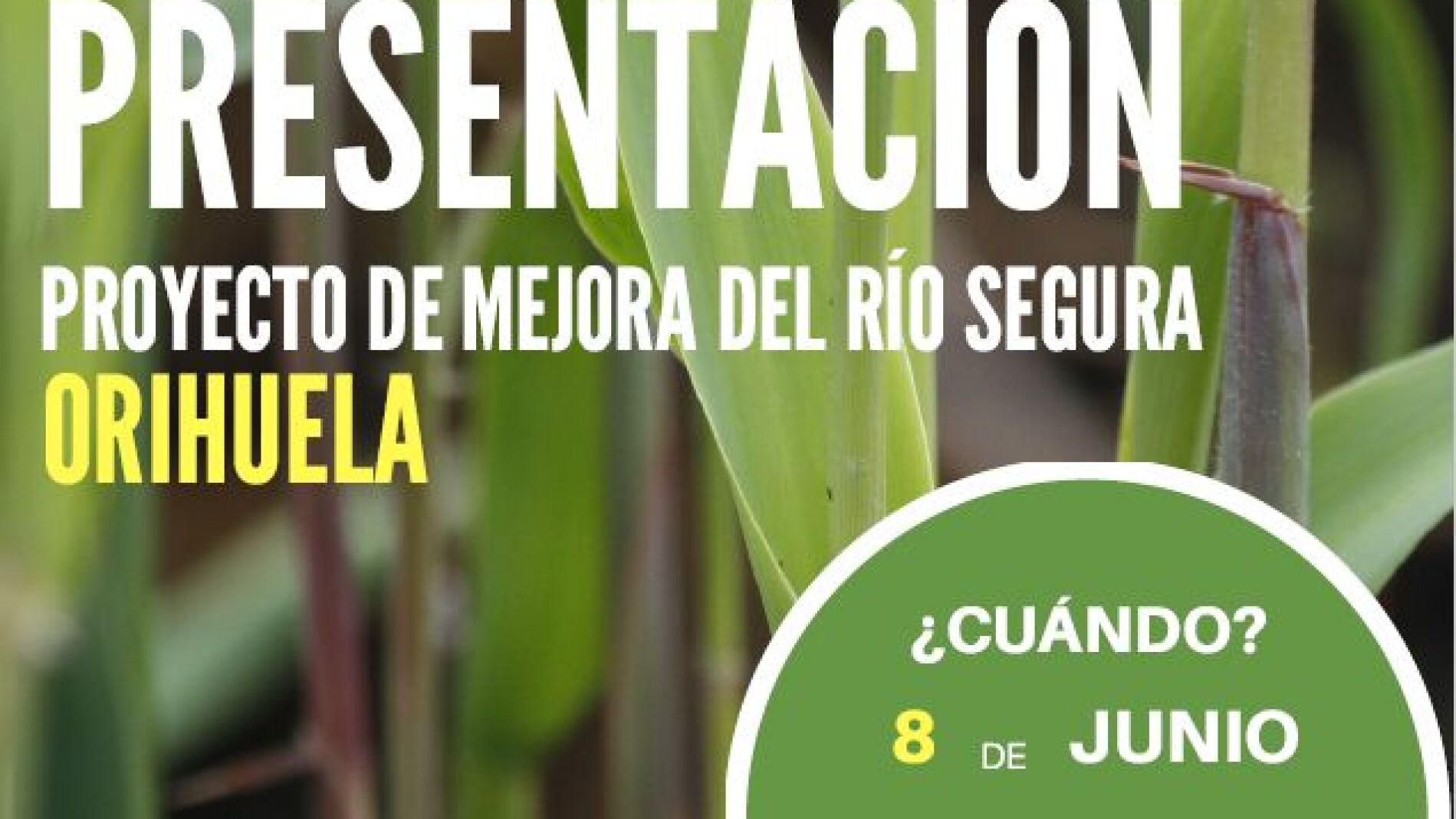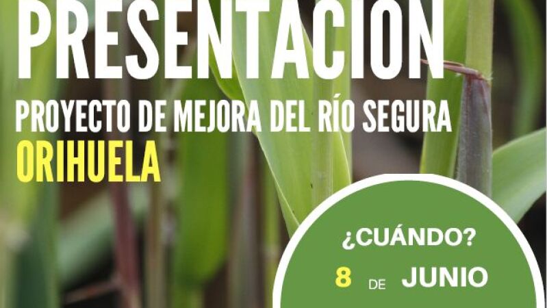 La Confederación Hidrográfica del Segura celebrará una jornada de información y participación ciudadana para presentar el proyecto de mejora del río Segura que se desarrollará agua arriba del núcleo urbano, entre el centro comercial Ociopía y el Molino que tendrá por objeto la eliminación del cañaveral mediante un empleo de distintas técnicas de erradicación de la caña (Arundo donax) y sustitución por especies autóctonas.