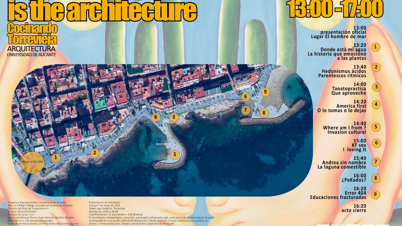 Este taller se centrará en el reconocimiento de las sujeciones que coartan la arquitectura, y confiados en que la interpretación de una deglución figurada, facilitará el alumbramiento de nuevas perspectivas. Las distintas perfomances se representarán secuencialmente a lo largo del Paseo Marítimo de Torrevieja según el programa adjunto, invitando a la participación de los ciudadanos que acudan exprofeso o se crucen con ellas.