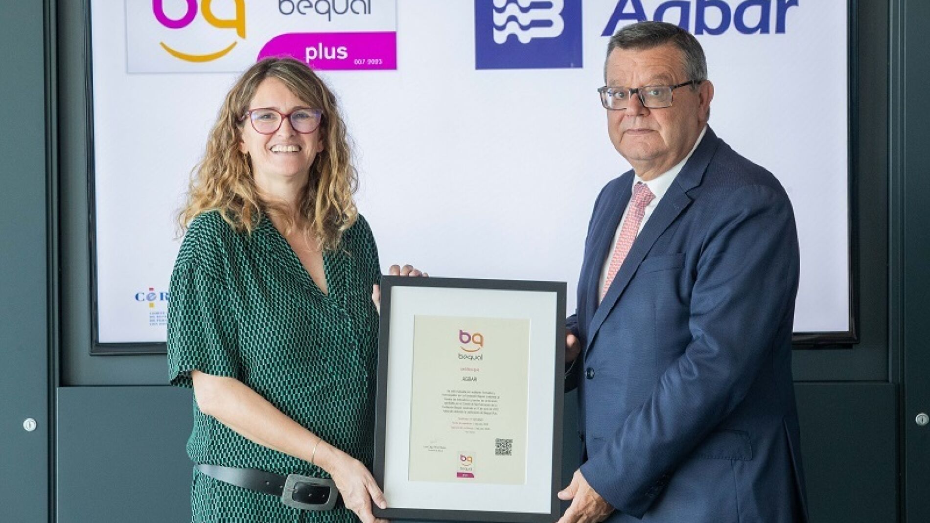 La entrega se ha celebrado en las oficinas de Agbar en Madrid y Dulcinea Meijide, directora de Equidad de Agbar, ha sido la encargada de recoger el sello Bequal Plus de manos de José Luis Martínez Donoso, vicepresidente ejecutivo de la Fundación Bequal y director general de Fundación ONCE.