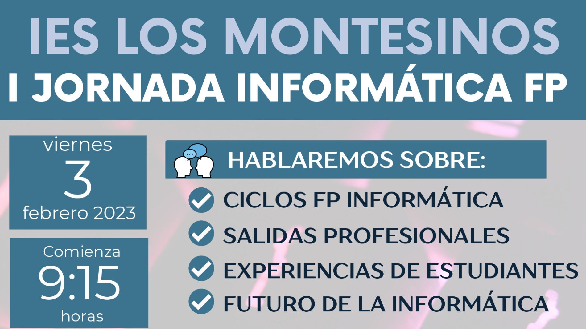 El departamento de informática del IES de Los Montesinos Remedios Muñoz, ha organizado la I Jornada Informática FP, para dar a conocer el trabajo del ciclo de informática Grado Medio del centro. En esta jornada se hablará de personas que han estudiado el ciclo de informática y su trabajo en la actualidad, de las nuevas tendencias del sector como la inteligencia artificial y el cloud computing. También participarán empresas tecnológicas punteras con los perfiles de FP de informática, y por último, se dará a conocer la oferta formativa de los ciclos formativos superiores y los nuevos “másteres” de la FP.