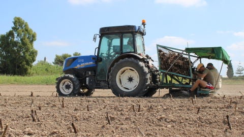 En este último caso, se planta en seco y, para ello, se labra el bancal y se cuenta con un tractor que lleva una reja y un cajón con las estacas que van clavando en la tierra los agricultores que se encuentran sentados en la parte posterior.