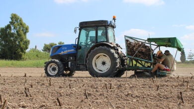El tractor discurre por la distancia adecuada entre las calles y los agricultores van plantando las estacas cada 50 centímetros.