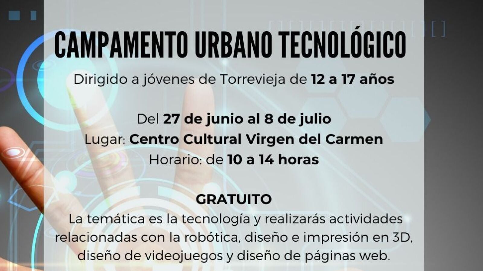 El concejal de Juventud del Ayuntamiento de Torrevieja, Domingo Paredes, informa que ya se ha abierto el plazo de inscripción en su Campamento Urbano Tecnológico de verano, dirigido a jóvenes adolescentes que hayan nacido entre los años 2005 y 2010, ambos inclusive, empadronados en Torrevieja, y que se desarrollará en las instalaciones del Cultural Virgen del Carmen, del 27 de junio al 8 de julio, en horario de 10:00 a 14:00 horas.