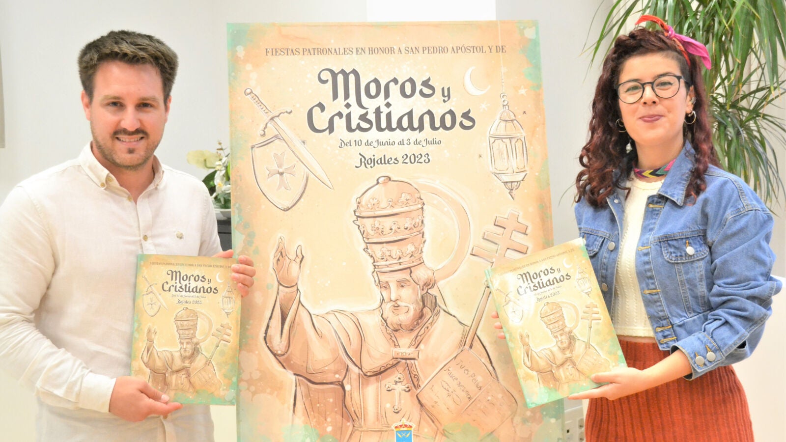 El concejal de Fiestas, Jesús Martinez Pascual, y la diseñadora gráfica e ilustradora, Marta Ruiz Hernández, han presentado este jueves el libro y el cartel de las fiestas patronales en honor a San Pedro Apóstol y de Moros y Cristianos que tendrán lugar del 10 de junio al 3 de julio.