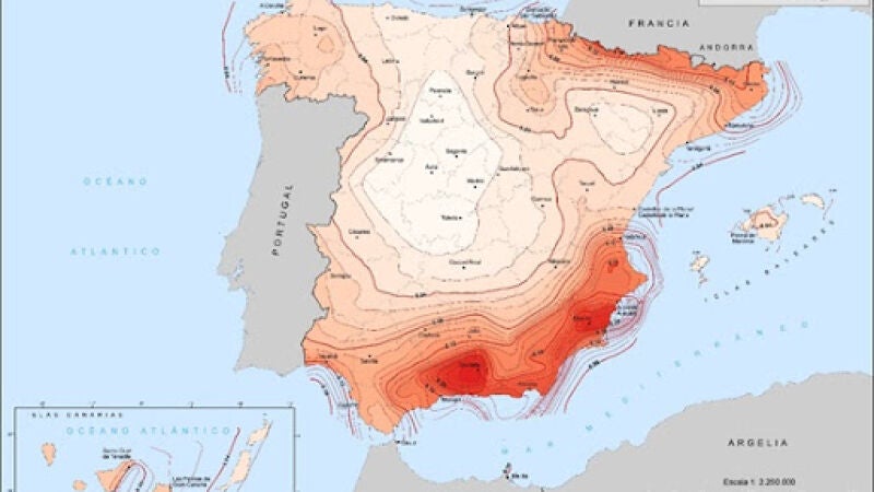 El tercio sur de la provincia de Alicante es la zona que presenta mayor riesgo de sufrir desplazamientos de suelo debido a terremotos de gran magnitud, según este mapa de peligrosidad sísmica, tal y como se aprecia en la fotografía que ilustra la noticia.