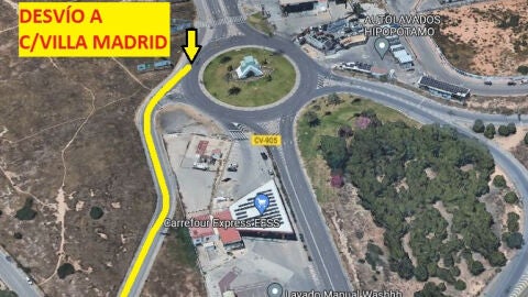 Para acceder a la calle Villa Madrid en sentido entrada a Torrevieja, se recomienda hacerlo por el ramal existente en la rotonda de la CV-90 (Grumo de Sal decorada con flamencos), continuando por las calles Juan Valera y José Mª de Pereda.