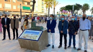 En el grabado del mosaico el autor simboliza en los laterales los productos típicos de la zona, así como las actividades industriales del momento. Como detalles, el embarcadero antiguo a la izquierda y el lentisco a la derecha.