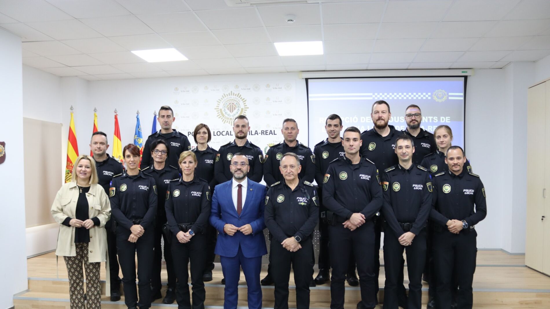 El alcalde de Vila-real, José Benlloch, la regidora de Seguridad Ciudadana, Silvia Gómez, y el comisario principal jefe de la Policía Local, José Ramón Nieto, han recibido hoy en los 14 nuevos agentes de la Policía Local que se incorporan, con plaza en propiedad, a la plantilla del cuerpo municipal de seguridad, que cuenta ya con 91 miembros.
