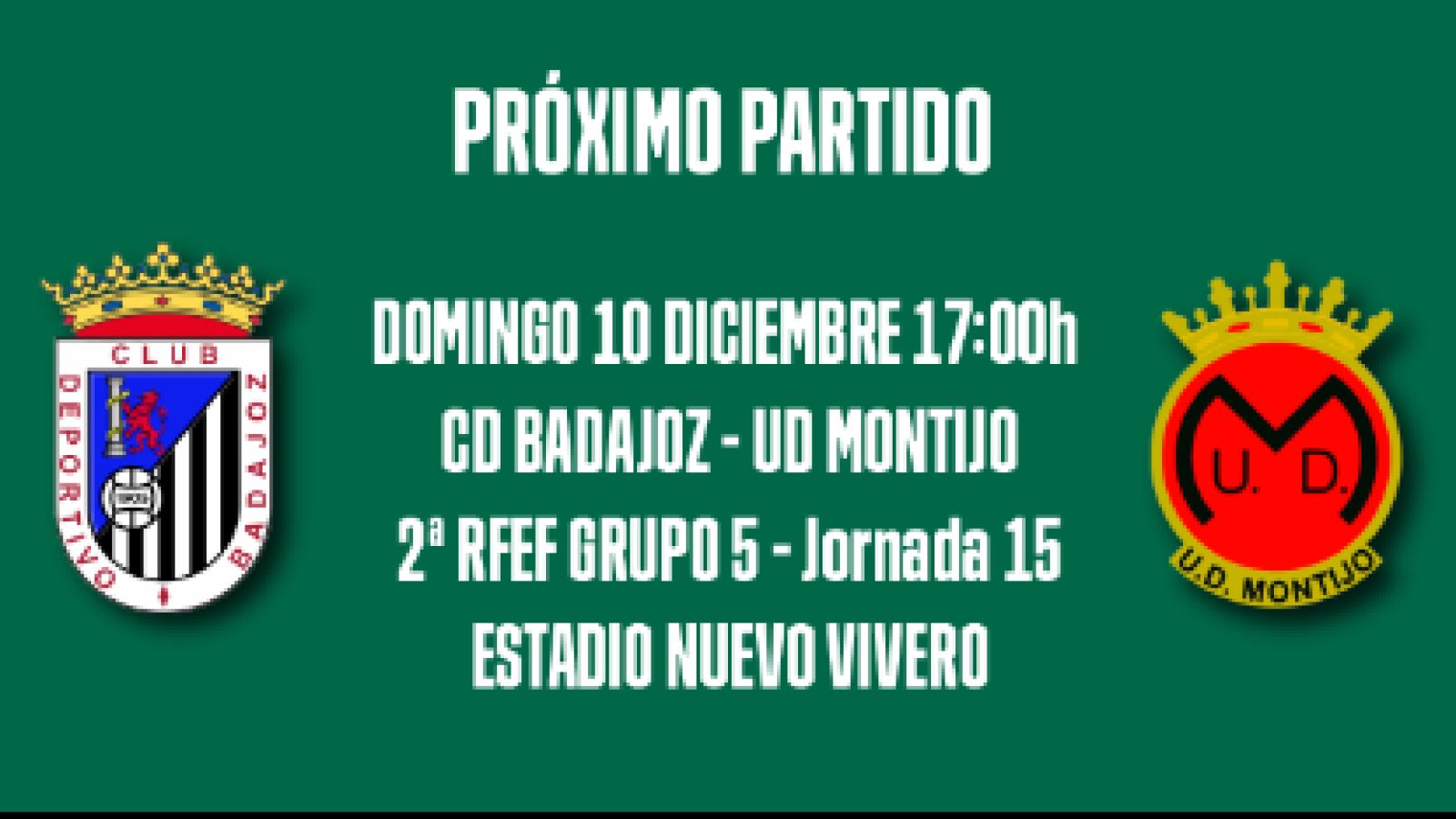 El CD Badajoz recibirá el próximo domingo 10 de diciembre a las 17:00h. en el Nuevo Vivero a la UD Montijo. Este partido está incluido en abono, por lo que el acceso con el carnet de abonado es gratuito.