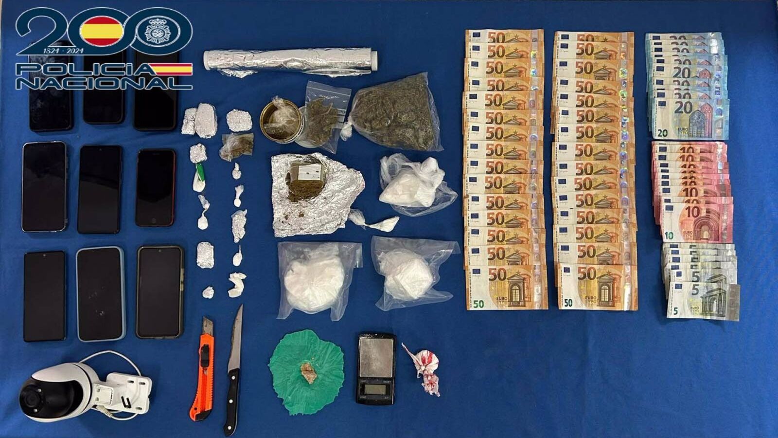 Además se incautaron 2,8 gramos de heroína, 2,3 gramos de cocaína, 2,8 gramos de hachís, pastillas de benzodiacepinas y 12 dosis de estupefacientes preparadas para su consumo; una balanza de precisión y útiles para el suministro y distribución de estupefacientes.