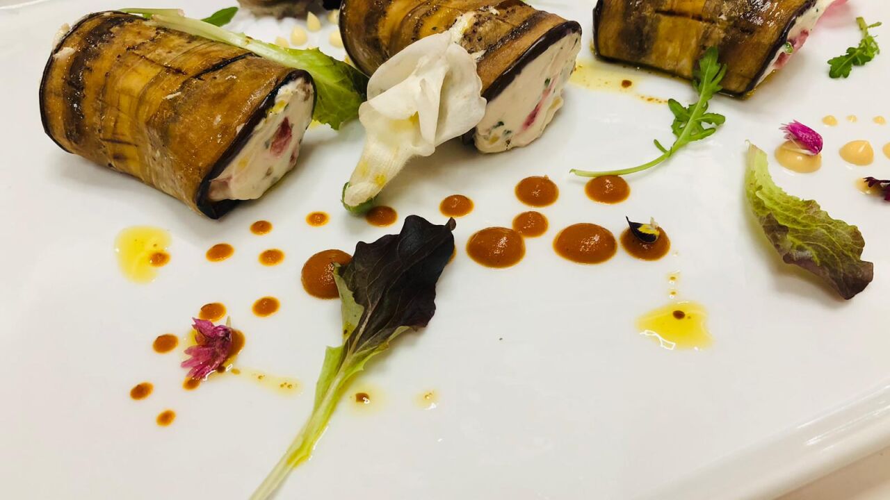• Por último, solamente nos queda montar el plato, pondremos una berenjena sobre la tabla pondremos nuestro relleno de queso crema con las fresas y demás ingredientes y enrollamos haciendo un canelón, haremos unos tres canelones por persona y ponemos la salsas decorando el plato, nuestro rollitos de berenjena y terminamos con los brotes germinados y flores.