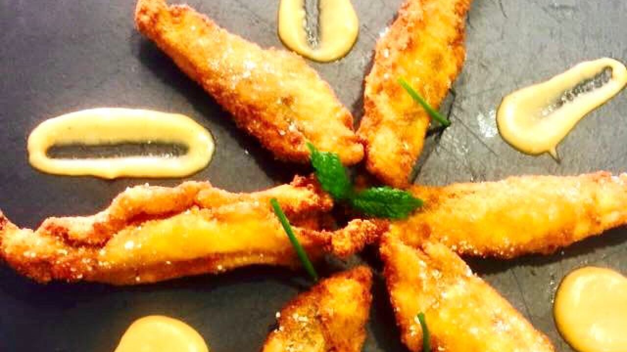 - Solo nos quedaría freír los boquerones en abundante aceite de oliva y a 180º de temperatura y emplatar decorando el plato con el pesto rojo y algunas hierbas aromáticas y/o flores.