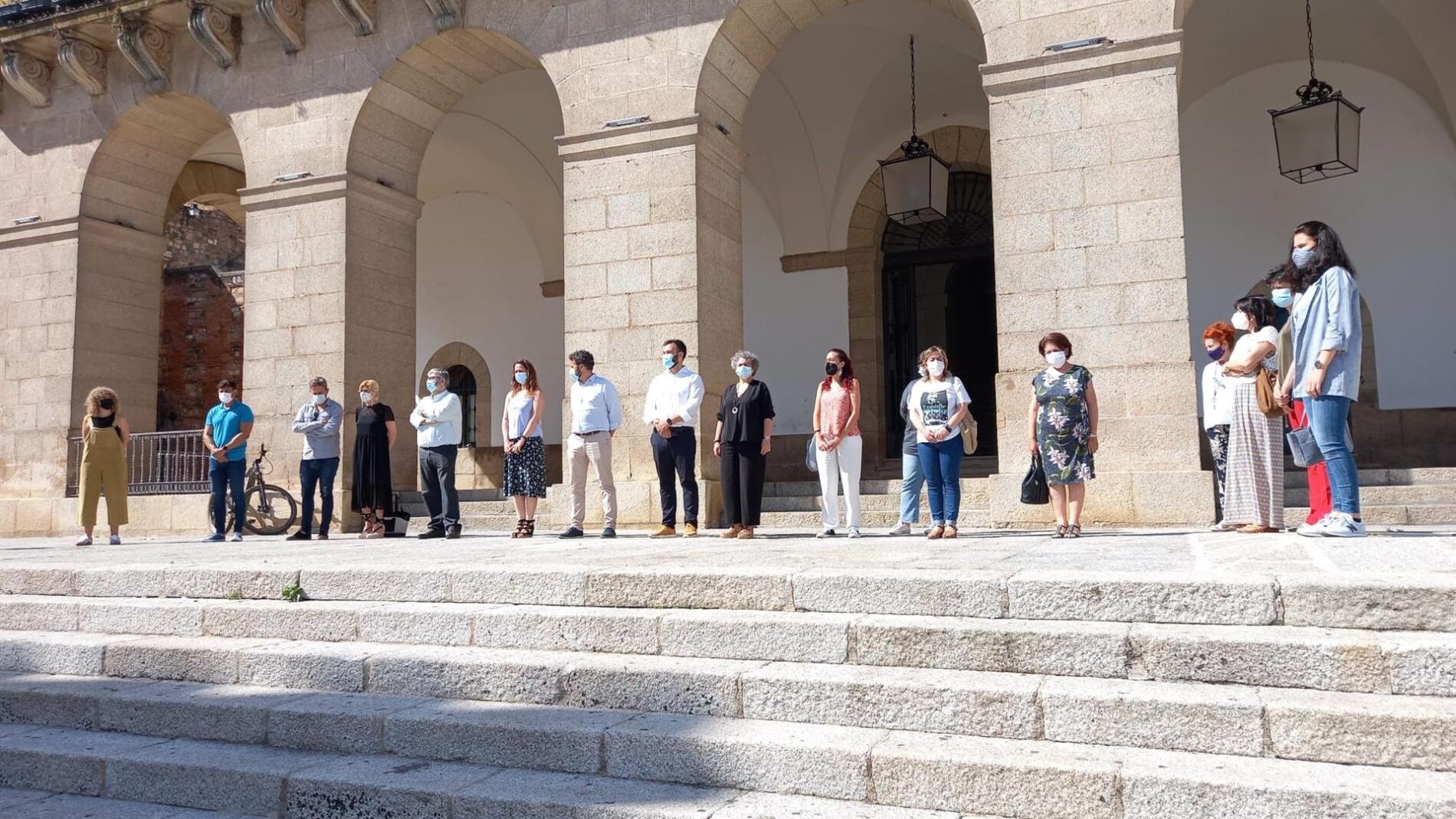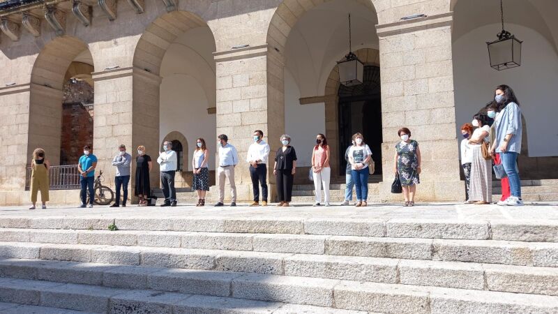 Miembros de la Corporación del Ayuntamiento de Cáceres han guardado este lunes un minuto de silencio en las escalinatas del edificio consistorial en repulsa por los últimos asesinatos machistas, entre ellos el de las niñas de Tenerife.