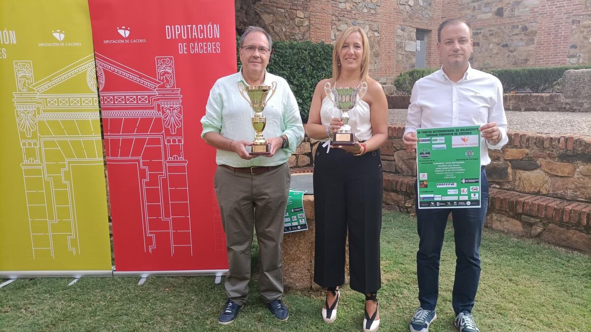 El presidente del Cáceres Ciudad del Baloncesto, José Manuel Sánchez, la diputada delegada de Turismo, Elisabeth Martín, y el diputado delegado de Deportes, Pablo Miguel López, han presentado este jueves en el Palacio de Carvajal esta cita deportiva de la provincia que cumple su novena edición.
