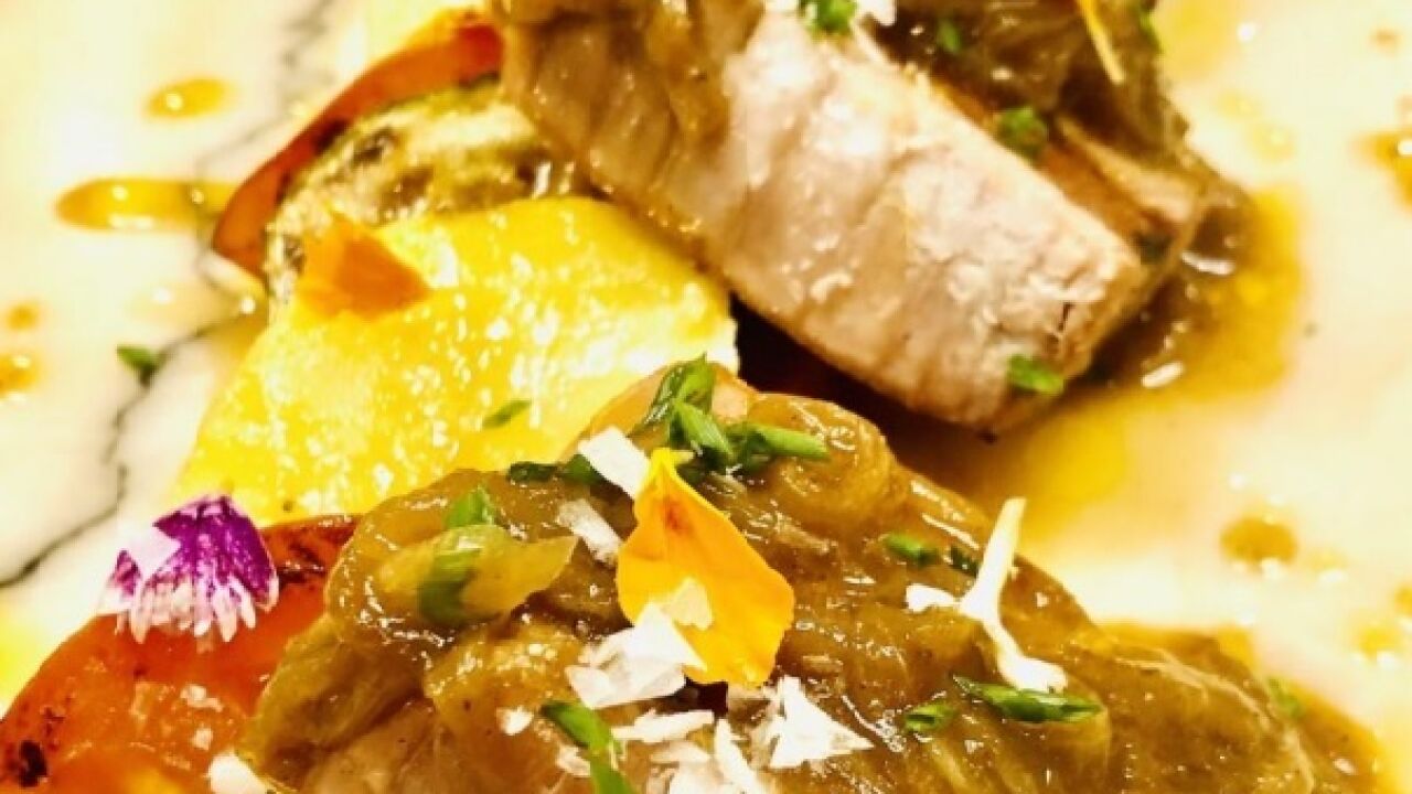 ✓ Y por último emplatamos con la patata, las verduras y salseamos con la cebolla terminando con unas hojas de claveles y sal en escamas.
