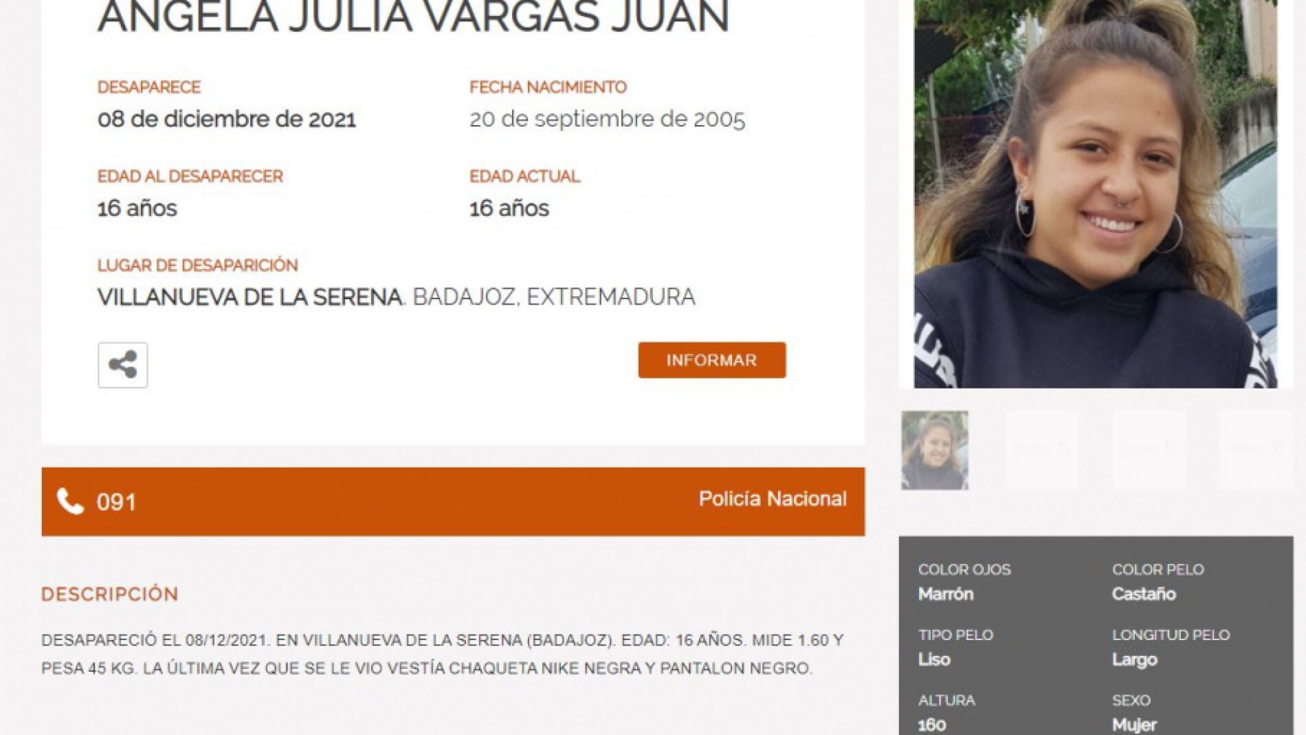 La Policía Nacional en Extremadura ha confirmado la desaparición de Ángela Julia Vargas Juan, de 16 años natural de Villanueva de la Serena. Según su ficha en el Centro Nacional de Desaparecidos, del Ministerio del Interior, desapareció el pasado 8 de diciembre.