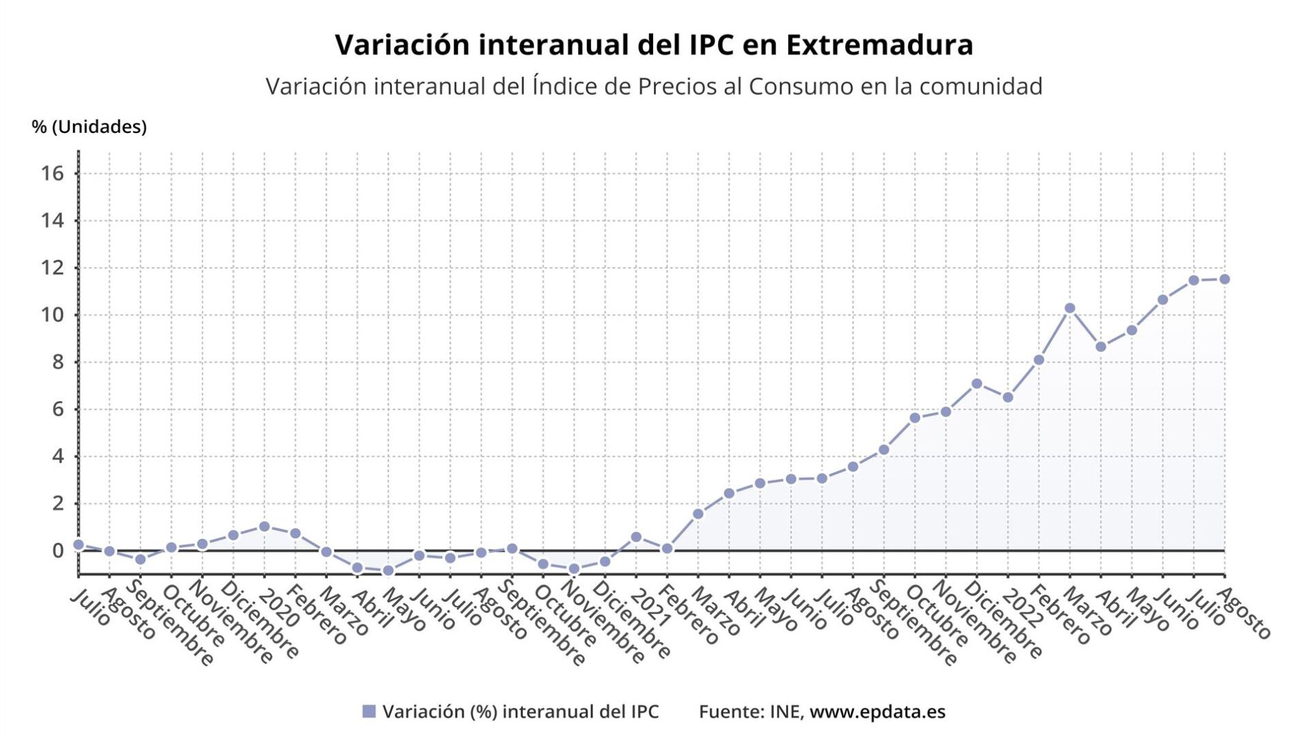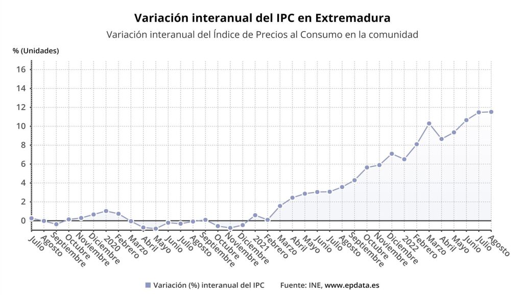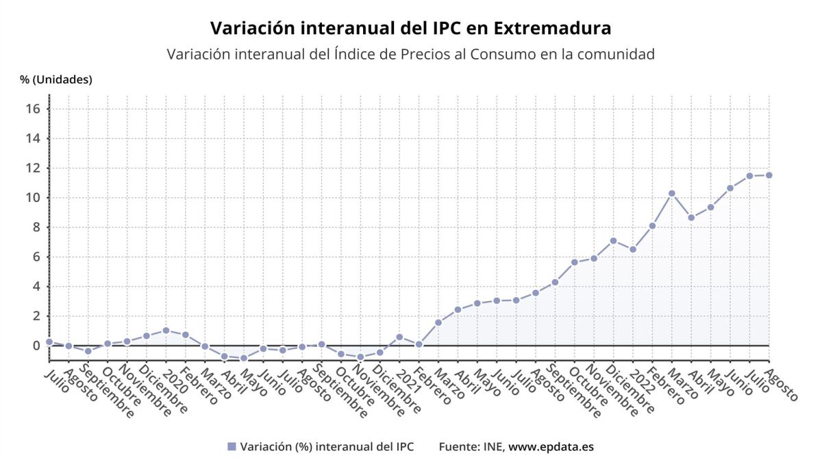 El Índice de Precios de Consumo (IPC) ha subido un 0,6 por ciento en Extremadura durante el mes de agosto con respecto al mes anterior, y en términos interanuales se dispara hasta el 11,5 por ciento, según los datos difundidos este martes por el Instituto Nacional de Estadística (INE).